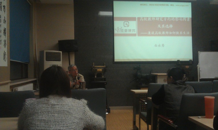 报告共分四部分:首先深刻阐述了三个观点“科研方向是高校教师职业生涯的平台”、“选择是成功的前提”、“专注是成功的保障”。其次,系统讲授了研究方向的影响因素,包括自身因素、工作因素、社会因素等。第三,结合自身的教学科研经历,阐述了选择方向就是选择一生幸福。第四,讲了五点体会。一是良好的心态是全家幸福的基础;二是自然是最高境界;三是无功利性就是快乐;四是双赢是团队可持续发展的条件;五是成功是奉献的结果。活动最后,白老师与青年教师就研究方向的选择、快乐生活进行了互动和交流。