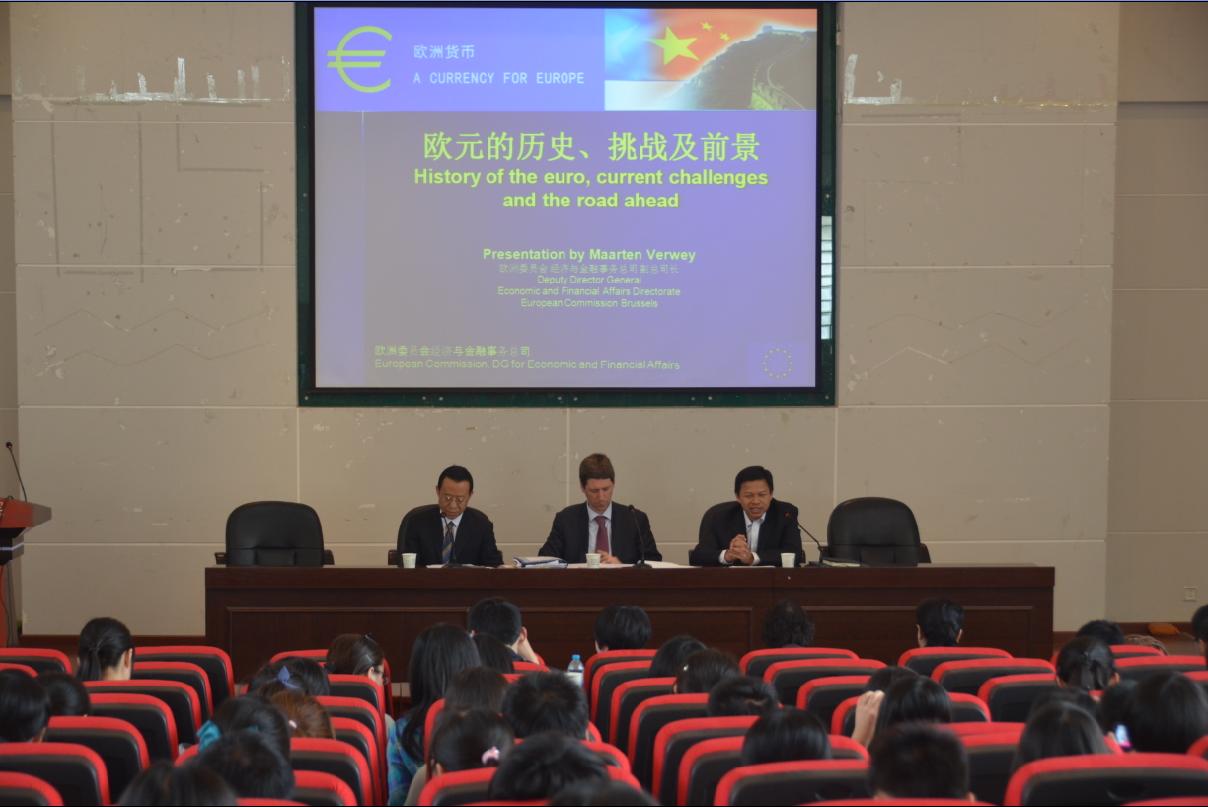 4月11日,由欧洲委员会经济与金融事务总司、欧盟驻华代表团和我院联合举办的欧元展学术报告会在金海报告厅举行,报告会的主题是“欧元的历史、挑战及前景”。来自中国人民银行和欧盟驻华代表团的代表出席了活动,来自陕西电视台、西安日报社和西部网等五家媒体对活动进行报道,我院260余名师生聆听了报告。报告会由西北大学党委副书记黄建民主持。