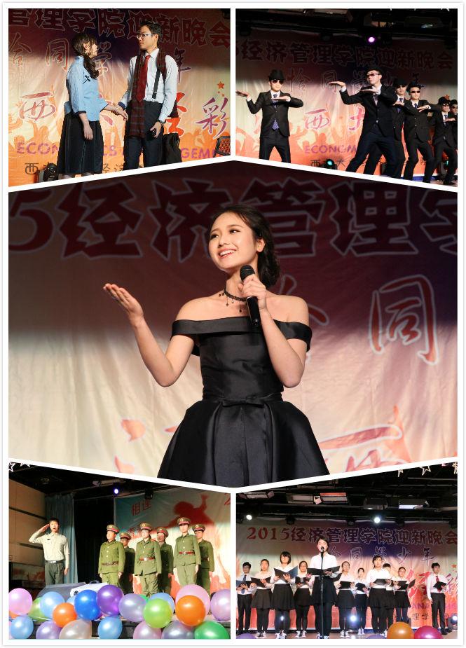晚会在同学们精心设计的开场秀中拉开了帷幕,装扮成活泼可爱的“小黄人”从各个方向进入会场,他们一边载歌载舞,一边向现场的观众们派发礼物,着实给了全场观众一个惊喜,晚会的氛围也瞬间被引爆。在主持人闪耀登场后,节目正式开始,晚会分为了“相逢”、“青春”、“梦想”三个篇章,所有节目均由2015级学生自编自导自演,节目形式多样,工商一班、信管班、旅游管理班分别带来了歌曲串烧《致青春》、独唱《望月》、歌舞《youth boom》,为大家上演了试听盛宴;国贸班的舞台剧《在青春的日子里》带领大家回忆了从高中到大学这段青葱岁月,展现了大一新生初入大学校园的心路历程;金工班的《西大梦想秀》、工商二班的《与梦想有关的日子》,为大家展现了经管学子对于梦想的理解和追求。院学生会也准备了舞蹈、话剧、朗诵、脱口秀等形式各样的节目,晚会精彩纷呈、高潮迭起。